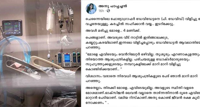 ''അവൾ മരിച്ചു മോളെ... വിളിച്ചു ഫോൺ വച്ചതേയുള്ളൂ. കരച്ചിൽ സഹിക്കാൻ വയ്യ.. ഇടറിക്കേട്ടു...മോളെ എവിടെയും വെൻറിലേറ്റർ ഒഴിവില്ല. തൃശൂരും എറണാകുളത്തും തിരയാത്ത ആശുപത്രികളില്ല. പരിചയമുള്ള ഡോക്ടർമാരുടെയും സുഹൃത്തുക്കളുടെയും നമ്പറുകളിലേക്ക് മാറി മാറി വിളിച്ചു കൊണ്ടിരിക്കയാണ്.. " നൊമ്പരമായി കുറിപ്പ്