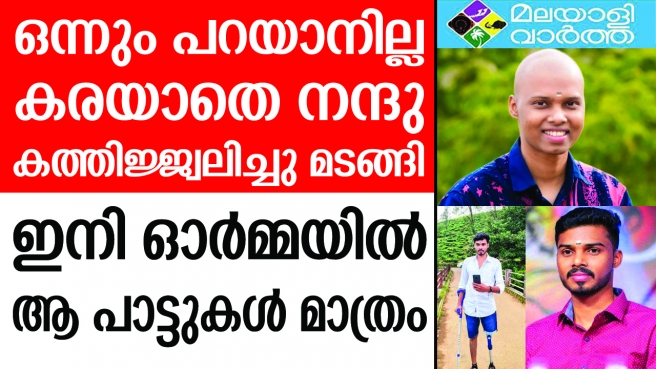 ഭരതന്നൂര് സ്വദേശിയായ നന്ദു ബി.ബി.എ. പഠനശേഷം സ്വന്തമായി ഒരു സംരംഭത്തിന് തയ്യാറെടുക്കുമ്പോഴായിരുന്നു 23ാം വയസ്സില് എല്ലില് കാന്സര് പിടികൂടിയത്. എനിക്ക് കാന്സറാണ്. പക്ഷേ, ഇതിനെയൊരു മഹാരോഗമായി പരിഗണിക്കില്ല. ചെറിയൊരു ജലദോഷംപോലെ ഞാനിതിനെ നേരിടും... ആത്മവിശ്വസത്തിന്റെ ഈ കുറിപ്പ് ഒന്നരലക്ഷത്തോളം പേര് വായിച്ച് ലൈക്കടിച്ചു. ആര്.സി.സി.യിലെ കീമോകള്ക്കിടയിലും ഒരുകാല് മുറിച്ചുമാറ്റേണ്ടിവന്നപ്പോഴുമൊക്കെ ആ ആത്മധൈര്യവും പുഞ്ചിരിയും കൈവിട്ടില്ല.