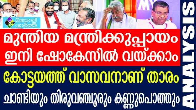 ഒത്തു കിട്ടിയാല് ഒത്തു തീര്പ്പു മുഖ്യമന്ത്രിയാകാനിരുന്ന ഉമ്മന് ചാണ്ടിയുടെ പുതുപ്പള്ളി ഉള്പ്പെടുന്ന പാമ്പാടിയില്നിന്നാണ് വിഎന് വാസവന്റെ വരവ്. അതായത് വാസവന് കൊടിവെച്ച കാറില് പാമ്പാടിയിലെ വീട്ടിലെത്തുന്ന സാഹചര്യമാണ് പുതുപ്പള്ളിയിലെ ഉമ്മന് ചാണ്ടി ഭക്തരായകോണ്ഗ്രസുകാര്ക്ക് കാണേണ്ടിവരുന്നത്.