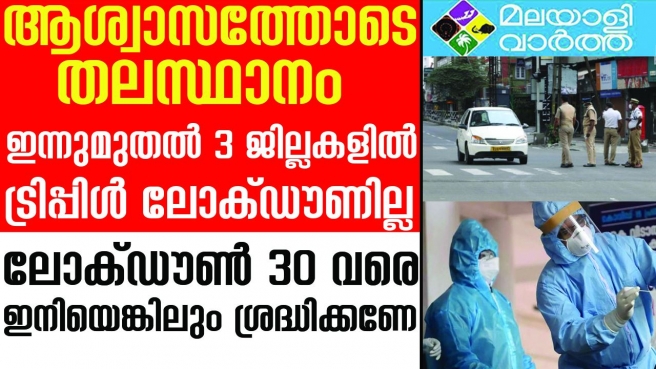 ഒരാഴ്ചയായി തുടരുന്ന ട്രിപ്പിള് ലോക് ഡൗണ് അവസാനിച്ചു. എറണാകുളം, തൃശൂര്, തിരുവനന്തപുരം ജില്ലകളില് ഇന്നു രാവിലെ മുതല് ട്രിപ്പിള് ലോക്ഡൗണ് ഒഴിവാക്കി. മലപ്പുറത്തു ട്രിപ്പിള് ലോക്ഡൗണ് തുടരും. മലപ്പുറം ഒഴികെയുള്ള 3 ജില്ലകളില് കോവിഡ് രോഗ സ്ഥിരീകരണ നിരക്ക് (ടിപിആര്) 25 ശതമാനത്തിനു താഴെയാവുകയും സജീവ കേസുകള് കുറയുകയും ചെയ്ത സാഹചര്യത്തിലാണ് സാധാരണ ലോക്ഡൗണിലേക്കു മാറുന്നത്. അതേസമയം കോവിഡ് വ്യാപനം തുടരുന്ന സാഹചര്യത്തില് സംസ്ഥാനത്ത് ലോക്ഡൗണ് ഈ മാസം 30 വരെ നീട്ടി.