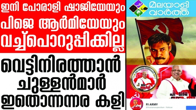 കണ്ണൂരിലെ സമ്മുന്നത നേതാവായ പി. ജയരാജന്റെ ഫാന്സ് സംഘം നിയന്ത്രിക്കുന്ന പേജാണ് പി.ജെ. ആര്മി. പോരാളി ഷാജിയുടെ നിലപാടിന് പി.ജെ. ആര്മി പിന്തുണയുമായി രംഗത്തെത്തിയതോടെ രണ്ടിനെയും ഒരുമിച്ച് ഒതുക്കാനാണ് പാര്ട്ടി തീരുമാനം. ഇത് എത്ര വിജയിക്കുമെന്ന് കണ്ടറിയാം.