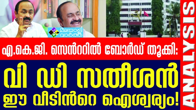 എ.കെ.ജി. സെന്ററില് ബോര്ഡ് തൂക്കി: വി ഡി സതീശന് ഈ വീടിന്റെ ഐശ്വര്യം! വി.ഡി. സതീശന് പ്രതിപക്ഷ നേതാവായത് പിണറായി വിജയന്റെ ജനപ്രീതി വര്ധിപ്പിക്കാനോ?