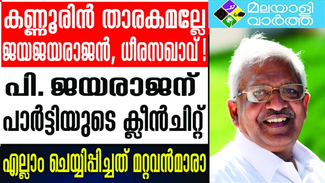സിപിഎം നേതാവ് പി. ജയരാജനെപ്പറ്റി ഓര്ക്കുമ്പോള് അറിയാതെ എത്തുന്ന ഒരു ഗാനമുണ്ട്. ചെഞ്ചോരപ്പൊന് കതിരല്ലേ, ചെമ്മണ്ണിന് മാനം കാക്കും നന്മതന് പൂമരമല്ലോ, കണ്ണൂരിന് താരകമല്ലേ ജയജയരാജന് ധീരസഖാവ്... ഈ പാട്ട് തന്നെയാണ് ജയരാജനെ വളര്ത്തിയതും തളര്ത്തിയതും. ജയരാജനെ ഒതുക്കിയതിന് പിന്നില് ഈ പാട്ടിന് വലിയ പങ്കുണ്ട്. മാത്രമല്ല പിജെ ആര്മിയേയും പലരും ഭയന്നു.