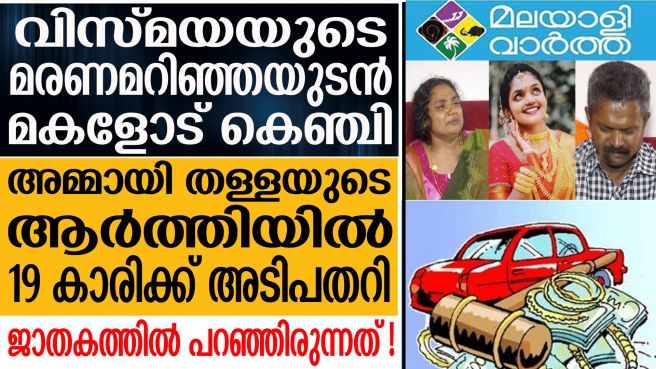 വിസ്മയയുടെ മരണവാര്ത്ത കണ്ടപ്പോള് ഉടനെ ഭയന്ന് മകളെ വിളിച്ചു..... അവിവേകം ഒന്നും കാണിക്കരുതെന്ന് ആ മാതാപിതാക്കള് കെഞ്ചി പറഞ്ഞു...പക്ഷേ അമ്മായി അമ്മയുടെ ആര്ത്തിക്ക് മുന്നില് പിടിച്ചു നില്ക്കാന് ആ 19കാരിക്ക് കഴിഞ്ഞില്ല.... ആലപ്പുഴയിലെ 19 കാരിയുടെ ജീവനെടുത്തത് അമ്മായിഅമ്മയുടെ ആര്ത്തി....