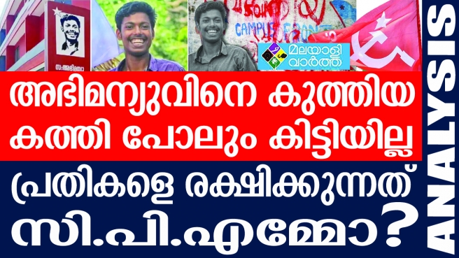 മഹാരാജാസ് കോളേജിലെ എസ്.എഫ്.ഐ. നേതാവ് അഭിമന്യു (20) കൊല്ലപ്പെട്ടിട്ട് വെള്ളിയാഴ്ച മൂന്നു വര്ഷം തികയുമ്പോള് കേരളം ഭരിക്കുന്ന ഇടതു മുന്നണി സര്ക്കാരിന് കേസിലെ പ്രധാന തൊണ്ടി മുതലായ കത്തി കണ്ടെത്താന് കഴിഞ്ഞിട്ടില്ല... കേസിലെ പ്രതികള് ശിക്ഷിക്കപ്പെടാതിരിക്കുമോ എന്ന സംശയം നിയമവൃത്തങ്ങള്ക്കിടയില്.....