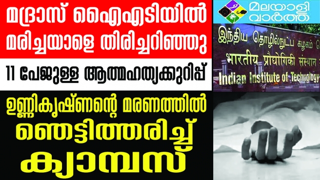 ഒട്ടും പ്രതീക്ഷിച്ചില്ല... മദ്രാസ് ഐഐടിയില് മരിച്ചത് മലയാളി പ്രോജക്ട് അസോഷ്യേറ്റ് ആര്. ഉണ്ണിക്കൃഷ്ണന് നായര്; 22 കാരന്റെ വേര്പാടില് വിറങ്ങലിച്ച് ഐഐടി കാമ്പസ്; മാനസിക സമ്മര്ദം കാരണം ജീവനൊടുക്കുകയാണെന്നും മരണത്തിന് ആരും ഉത്തരവാദിയല്ലെന്നും കുറിപ്പ്