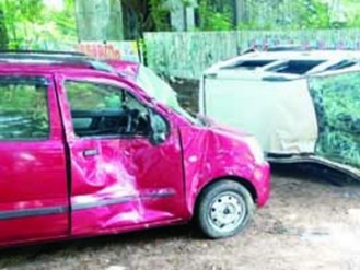 കാട്ടൂര് കോര്മശേരിവീട്ടില് സുബാബുവിന്റെ കാറിലിടിച്ചാണ് ഇവരുടെ കാര് മറിഞ്ഞത്. സാങ്കേതിക വിദ്യാഭ്യാസ വകുപ്പ് ജീവനക്കാരനായ സുബാബു കെ.എസ്.ഇ.ബി. കലവൂര് സെക്ഷന് ഓഫീസില് ബില്ലടയ്ക്കാനെത്തിയതായിരുന്നു.