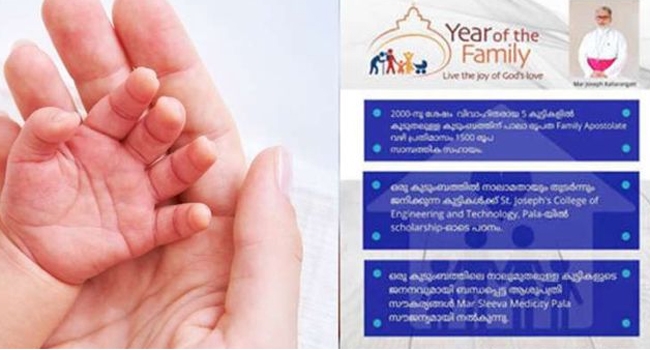 പാലാ രൂപതയുടെ വേറിട്ട പരസ്യം വിവാദത്തില്....അഞ്ചുകുട്ടികളില് കൂടുതലുള്ളവര്ക്ക് മാസം 1,500 രൂപ നല്കുമെന്ന് പാലാ രൂപത