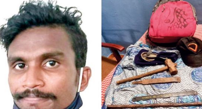 ചുറ്റിക, ഇരുമ്പ് ദണ്ഡ്, ഉളി എന്നിവയടങ്ങിയ സ്കൂള് ബാഗ് ഇയാളുടെ പക്കല് നിന്ന് കണ്ടെത്തി. ആലപ്പുഴയില് നിന്ന് പ്രണയിച്ച് വിവാഹം കഴിച്ചതില് ഒരു കുട്ടിയുണ്ട്.