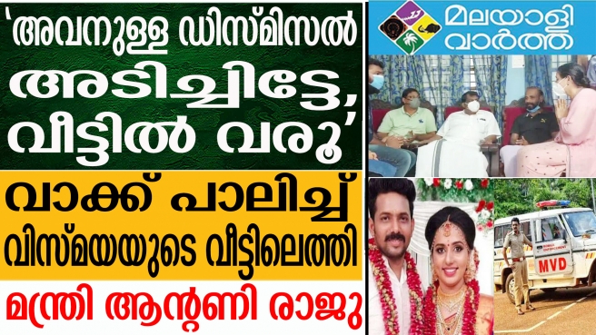 ‘അവനുള്ള ഡിസ്മിസൽ അടിച്ചിട്ടേ, വീട്ടിൽ വരൂ’ വാക്ക് പാലിച്ച് വിസ്മയയുടെ വീട്ടിലെത്തി മന്ത്രി ആന്റണി രാജു....