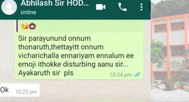 കോളേജ് വിദ്യാർത്ഥിനികളുടെ ഉറക്കംകെടുത്തി അധ്യാപകന്റെ രാത്രികാല വീഡിയോ കോളും, ചുംബന സ്മൈലികളും:- പൊറുതി മുട്ടിയതോടെ സ്നേഹം വാരിവിതറിയ ചെമ്പഴന്തി എസ്എൻ കോളജ് പൊളിറ്റിക്കൽ സയൻസ് ഡിപ്പാർട്ട്മെന്റിലെ അധ്യാപകനും എൻഎസ്എസ് പ്രോഗ്രാം ഓഫീസറുമായ ടി അഭിലാഷിനെതിരെ പരാതിയുമായി ഗവർണർക്ക് മുമ്പിൽ വിദ്യാർത്ഥിനികൾ