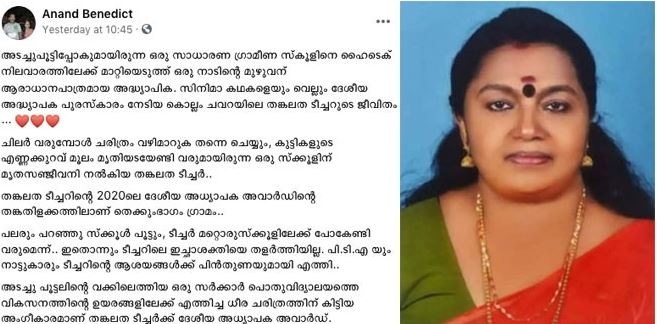 'അടച്ചുപൂട്ടിപ്പോകുമായിരുന്ന ഒരു സാധാരണ ഗ്രാമീണ സ്കൂളിനെ ഹൈടെക് നിലവാരത്തിലേക്ക് മാറ്റിയെടുത്ത് ഒരു നാടിന്റെ മുഴുവന് ആരാധാനപാത്രമായ അദ്ധ്യാപിക. സിനിമാ കഥകളെയും വെല്ലും ദേശീയ അദ്ധ്യാപക പുരസ്കാരം നേടിയ കൊല്ലം ചവറയിലെ തങ്കലത ടീച്ചറുടെ ജീവിതം...' വൈറലായി കുറിപ്പ്