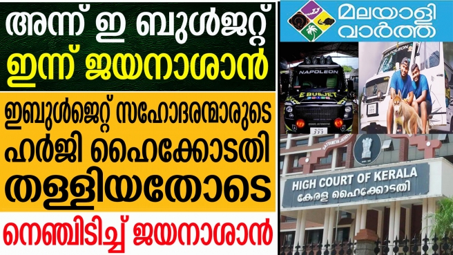 ഇത്രയൊക്കെ പറ്റുമോ... ട്രാവല് വ്ളോഗര്മാരായ ഇ ബുള്ജെറ്റ് സഹോദരന്മാരുടെ ഹര്ജി ഹൈക്കോടതി തള്ളിയത് മോട്ടോര്വാഹന വകുപ്പിന്റെ ആദ്യ വിജയം; മോട്ടോര് വാഹന വകുപ്പിന്റെ അടുത്ത കളി വെള്ളത്തില് വണ്ടിയോടിച്ച ജയനാശാനോട്; ഇബുള്ജെറ്റ് സഹോദരന്മാരുടെ ഹര്ജി തള്ളിയതോടെ നെഞ്ചിടിച്ച് ജയനാശാന്