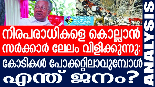 ഒരു തുള്ളി മഴ പെയ്താല് ഉരുള്പൊട്ടലുണ്ടാകുന്ന നാട്ടില് ക്വാറികള് വേണ്ടേ വേണ്ടന്ന് മുറവിളി ഉയരുമ്പോള് സി പി ഐ എന്ന ആദര്ശ പാര്ട്ടിയുടെ റവന്യുമന്ത്രി നാടുനീളെ ക്വാറികള് അനുവദിക്കാന് അപേക്ഷ ക്ഷണിച്ചു. സി പി എമ്മിന്റെ കൂടി അനുമതിയില്ലാതെ ഇത്തരമൊരു തീരുമാനമെടുക്കാന് സി പി ഐക്ക് കഴിയില്ല. അതായത് പാവപ്പെട്ട നിരപരാധികളെ കുരുതി കൊടുക്കാന് സര്ക്കാര് ലേലം വിളിക്കുന്നു എന്ന് ചുരുക്കം.