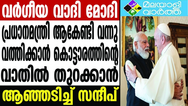 തൊലി പൊളിഞ്ഞ് പോകുന്നു... നരേന്ദ്ര മോദി ക്ഷണിച്ചതോടെ മാര്പ്പാപ്പയുടെ ഇന്ത്യാ സന്ദര്ശനം ഉറപ്പായി; അതിന് പിന്നാലെ എതിരാളികളെ ആഞ്ഞടിച്ച് സന്ദീപ് വാചസ്പതി; മാര്പ്പാപ്പ വന് ചതിയാണ് കാണിച്ചത്, വര്ഗീയ വാദി മോദി പ്രധാനമന്ത്രി ആകേണ്ടി വന്നു വത്തിക്കാന് കൊട്ടാരത്തിന്റെ വാതില് ഇന്ത്യക്ക് വേണ്ടി തുറക്കാന്