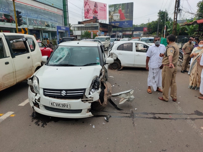 രാവിലെ 9.30 ഓടെ മണിപ്പുഴ സിഗ്നൽ ജംഗ്ഷനിലായിരുന്നു അപകടം. ചിങ്ങവനം ഭാഗത്തു നിന്നും എത്തിയ കാർ നിയന്ത്രണം വിട്ട് മുന്നിലെ സിഗ്നനിൽ നിർത്തിയിട്ടിരുന്ന മറ്റൊരു കാറിൽ ഇടിക്കുകയായിരുന്നു. ഇടിയുടെ ആഘാതത്തിൽ നിയന്ത്രണം വിട്ട് കാർ, മുന്നിലെത്തിയ സ്കൂട്ടറിലും മറ്റൊരു ബൈക്കിലും ഇടിക്കുകയായിരുന്നു. ഇടിയുടെ ആഘാതത്തിൽ കാറിന്റെ പിൻഭാഗം പൂർണമായും തകർന്നു.