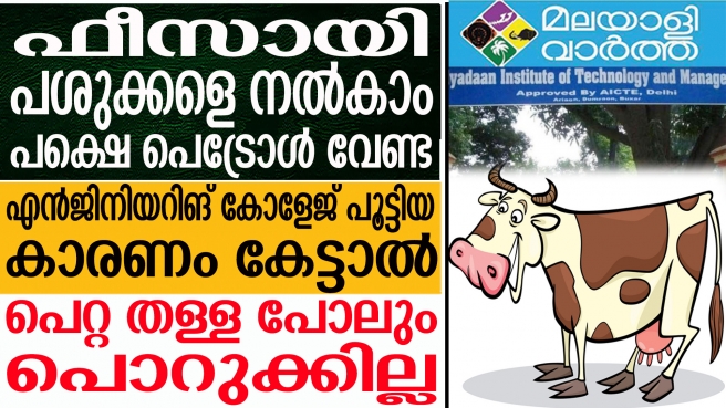 പെട്രോള് വിലയുടെ വാര്ത്തയ്ക്കിടയില് ആരും ശ്രദ്ധിക്കാത്ത വാര്ത്തയുണ്ട്. ഫീസ് ആയി പശുക്കളെ നല്കാം എന്ന വ്യവസ്ഥയുടെ പേരില് പ്രശസ്തിയാര്ജിച്ച ബിഹാറിലെ വി.ഐ.ടി.എം കോളേജ് അടച്ചുപൂട്ടി. നാല് വര്ഷത്തെ എഞ്ചിനീയറിങ് കോഴ്സിന്റെ ഫീസായി അഞ്ച് പശുക്കളെ നല്കിയാല് മതിയെന്നായിരുന്നു കോളേജിന്റെ വാഗ്ദാനം. കോളേജ് അടച്ചുപൂട്ടിയ നടപടി മൂന്നൂറോളം വിദ്യാര്ഥികളുടെ ഭാവിയും അവതാളത്തിലാക്കി.
