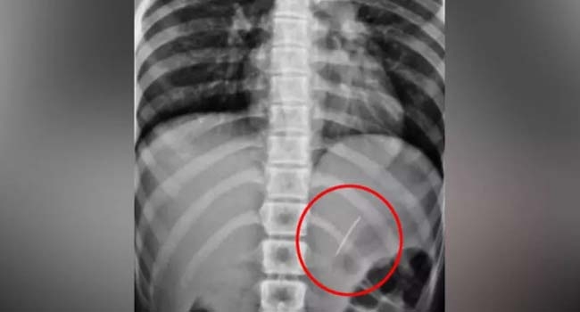 അവിടത്തെ എക്സ് റേ പരിശോധനയില് ആമാശയത്തില് പിന് തറച്ചതായി കണ്ടെത്തി. ഗ്യാസ്ട്രോ എന്ററോളജി വിഭാഗം മേധാവി ഡോ. സജു സേവ്യര്, ഗ്യാസ്ട്രോ എന്ററോളജിസ്റ്റ് ഡോ. ബിപിന്, ഡോ. സാജന് എന്നിവരുടെ നേതൃത്വത്തില് സര്ജറി കൂടാതെ എന്േറാസ്കോപിക് വഴി പിന് പുറത്തെടുക്കാനായി.
