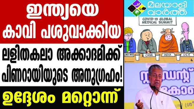 കേരള ലളിതകലാ അക്കാദമി നമ്മുടെ രാജ്യത്തെ അപമാനിക്കുന്ന കാര്ട്ടൂണിന് സമ്മാനം നല്കിയതെന്തിന്? ഇന്ത്യയെ കാവി പശുവാക്കിയ ലളിതകലാ അക്കാദമിക്ക് പിണറായിയുടെ അനുഗ്രഹം!