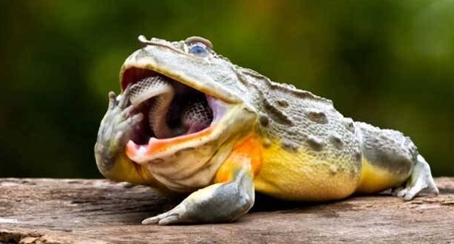 മനുഷ്യര് കൈ ഉപയോഗിച്ച് ഭക്ഷണം വായ്ക്കകത്തേയ്ക്ക് വയ്ക്കുന്നതുപോലെ തവള മുന്കാലുപയോഗിച്ച് പാമ്പിനെ വായ്ക്കകത്തേയ്ക്ക് തള്ളിക്കയറ്റി വയ്ക്കുന്ന ചിത്രങ്ങളാണ് ഏവരെയും അത്ഭുതപ്പെടുത്തുന്നത്.