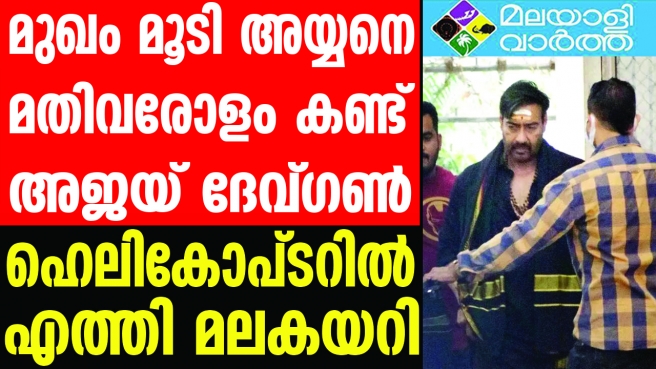 ഇന്നലെ രാവിലെ കൊച്ചിയിലെത്തിയ താരം ഹെലികോപ്റ്ററില് നിലയ്ക്കലില് ഇറങ്ങിയശേഷം അവിടെ നിന്ന് വാഹനമാര്ഗം പമ്പയിലെത്തുകയായിരുന്നു. തുടര്ന്ന് ഡോളിയിലാണ് മല കയറിയത്. സന്നിധാനത്ത് 11 മണിയോടെ എത്തിയ അജയ് ദേവഗണ് അല്പ്പസമയം മരാമത്ത് കോംപ്ളക്സില് വിശ്രമിച്ചശേഷം ഇരുമുടിക്കെട്ടുമായി 11.30 ഓടെ പതിനെട്ടാം പടികയറി അയ്യപ്പനെ ദര്ശിച്ചു. തുടര്ന്ന് മാളികപ്പുറത്തും ദര്ശനം പൂര്ത്തിയാക്കി ഉച്ചയ്ക്ക് മുമ്പ് മടങ്ങി.