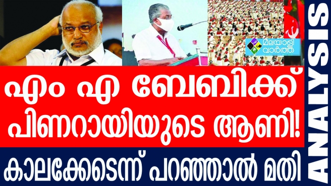 സഖാവ് എം എ ബേബിക്ക് പിണറായി വിജയന്റെ നേതൃത്വത്തിലുള്ള സി പി എം ഔദ്യോഗികപക്ഷത്തിന്റെ ആണി. തനിക്ക് സംഭവിച്ച അമളിയില് ആകെ പ്രതിസന്ധിയിലായിരിക്കുകയാണ് പോളിറ്റ് ബ്യൂറോ അംഗം എം.എ ബേബി. കഴിത്ത ദിവസങ്ങളില് അദ്ദേഹം തീര് ത്തും അസ്വസ്ഥനാണ്.
