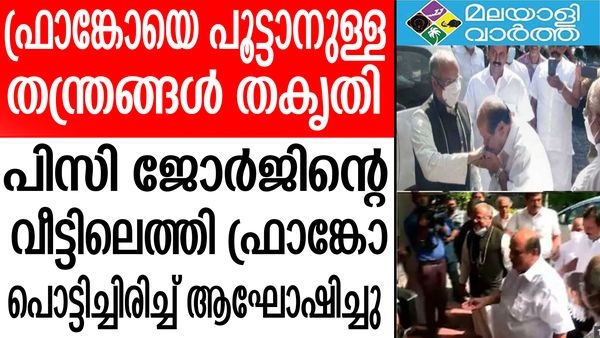 ഫ്രാങ്കോയുടെ കൈകള് മുത്തിക്കൊണ്ടാണ് ഭാര്യയും ജോര്ജും അദ്ദേഹത്തെ വീട്ടിലേക്ക് സ്വീകരിച്ചത്. കേസിന്റെ നാള്വഴികളില് തന്നെ പിന്തുണച്ചതിനുള്ള നന്ദിയും പിന്തുണയും അറിയിക്കാനാണ് ഭവനത്തില് എത്തിയതെന്ന് ഫ്രാങ്കോ മുളയ്ക്കല് പറഞ്ഞു. പരാതി നല്കിയ കന്യാസ്ത്രീക്കെതിരെ കേട്ടാല് അറക്കുന്ന ഭാഷയില് പ്രതികരണവുമായി പി.സി ജോര്ജ് പ്രതികരിച്ച് പി സി ജോര്ജ്ജ് മുന്പ് വിവാദങ്ങള് സൃഷ്ടിച്ചിരുന്നു.