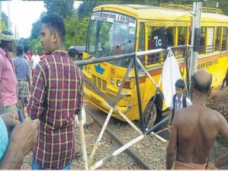 നെയ്യാറ്റിന്കര-ബാലരാമപുരം സ്റ്റേഷനുകള്ക്കിടയിലെ ആലുവിള തലയല് റയില്വേ ഗേറ്റില് ഇന്നലെ വൈകിട്ട് 3.50-നാണു സംഭവം. നെല്ലിമൂട് ന്യൂ ഹയര് സെക്കന്ഡറി സ്കൂളിലെ ബസാണ് അപകടത്തില്പ്പെട്ടത്. നാഗര്കോവില്-പുനലൂര് പാസഞ്ചര് ട്രെയിന് കടത്തിവിടാന് ഗേറ്റ് അടച്ചിട്ട ഉടനെയാണു ബസ് എത്തിയത്. ഗേറ്റിനു സമീപം കുട്ടികളെ ഇറക്കിയ ശേഷം ബസ് എടുത്തപ്പോള് നിയന്ത്രണം വിടുകയായിരുന്നു.