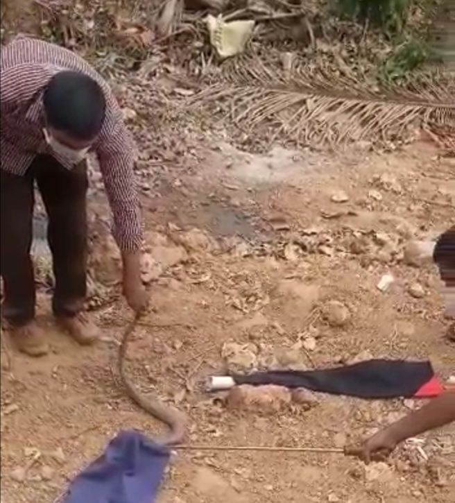 ചങ്ങനാശേരി മലകുന്നത്ത് കിണർ കുഴിച്ചുകൊണ്ടിരുന്ന തൊഴിലാളികളുടെ കുട്ടയിൽ മൂർഖൻ കുടുങ്ങി. എട്ടടിയിലധികം നീളമുള്ള മൂർഖനാണ് കുടുങ്ങിയത്. നാട്ടുകാർ വിവരം അറിയിച്ചതോടെ സ്ഥലത്ത് എത്തിയ വനം വകുപ്പിന്റെ സ്നേക് റസ്ക്യൂ സംഘത്തിലെ ഡോക്ടർ ഡോക്ടർ വിശാൽ സോണിയാണ് പാമ്പിലെ കുട്ടയിലാക്കിയത്.