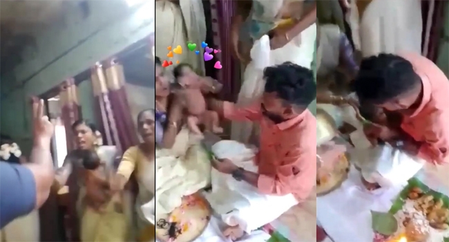ഒരു കുഞ്ഞിന്റെ പേരിടീൽ ചടങ്ങ് വളരെ പവിത്രവും, സന്തോഷവും നിറഞ്ഞു നിൽക്കുന്ന ഒരു ആഘോഷമാണ്. കുഞ്ഞ് ജനിച്ച് 28-ാം ദിവസമാണ് പൊതുവെ പേരിടീൽ ചടങ്ങ് നടക്കുന്നത്. അച്ഛനും അമ്മയും മുൻകൂട്ടി നിശ്ചയിച്ച പേര് വെറ്റില വച്ച് ഒരു കാത് അടച്ചു പിടിച്ചു മറുകാതിൽ മൂന്ന് പ്രാവശ്യം വിളിക്കുകയാണ് ചെയ്യുന്നത്. എന്നാൽ ഇന്നലെ സോഷ്യൽ മീഡിയയിൽ വൈറലായിരിക്കുന്ന ഒരു വീഡിയോയിൽ കുടുംബം മൊത്തം ഒരു പേരിടൽ ചടങ്ങിൽ തമ്മിൽ തല്ലുന്ന കാഴ്ചയാണ് ഉള്ളത്.