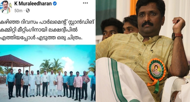 ലക്ഷദ്വീപിലെ ഭരണപരിഷ്കാരത്തിനെതിരെ കേരളത്തിൽ ഇടത് വലത് പാർട്ടികൾ ഒറ്റക്കെട്ടായി നിന്നാണ് വിമർശങ്ങൾ തൊടുത്തുവിട്ടത്. എന്നാൽ ഇപ്പോഴിതാ കെ മുരളീധരൻ എം.പി പാർലമെന്റ് സ്റ്റാൻഡിങ് കമ്മിറ്റി മീറ്റിംഗിനായി ലക്ഷദ്വീപ് സന്ദർശിച്ച ചിത്രം ഫെയ്ബുക്കിൽ പങ്കുവെച്ചിരിക്കുകയാണ്. ഈ ചിത്രത്തെ പരിഹസിച്ച് കൊണ്ട് രംഗത്തെത്തിയിരിക്കുകയാണ് ബി.ജെ.പി വക്താവ് സന്ദീപ് വചസ്പതി.