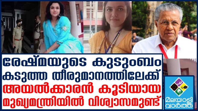 പാര്ട്ടിക്കാര് തള്ളിപ്പറയുന്നത് സങ്കടകരമാണ്. രേഷ്മയെ അപമാനിക്കുന്ന തരത്തിലുള്ള സിപിഎം നേതാവ് കാരായി രാജന് അടക്കമുള്ളവരുടെ ഫെയ്സ്ബുക് പോസ്റ്റുകളുടെ പകര്പ്പു കൂടി ഉള്പ്പെടുത്തി കുടുംബാംഗങ്ങള് ഇന്നലെ മുഖ്യമന്ത്രിക്കു പരാതി അയച്ചു. സിപിഎം ജില്ലാ സെക്രട്ടറി എം.വി.ജയരാജന് നടത്തിയ അധിക്ഷേപ പരാമര്ശവും പരാതിയില് ചൂണ്ടിക്കാട്ടിയിട്ടുണ്ട്. എം.വി.ജയരാജന് കഴിഞ്ഞ ദിവസം നടത്തിയ പത്രസമ്മേളനത്തില് അശ്ലീലച്ചുവയോടെ സംസാരിച്ചെന്നു പരാതിയില് വ്യക്തമാക്കുന്നുണ്ട്.