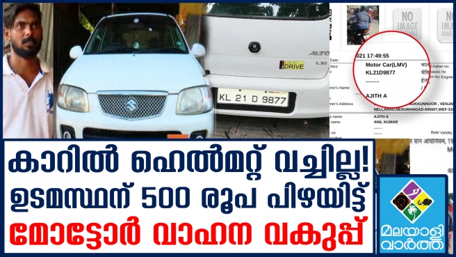 വാഹനയാത്രക്കാര് റോഡ് നിയമങ്ങള് ലംഘിക്കുന്നത് കണ്ടെത്തുന്നതിനായി മുക്കിനും മൂലയ്ക്കും വരെ ക്യാമറകള് സ്ഥാപിച്ചിരിക്കുകയാണ് പോലീസും മോട്ടോര് വാഹന വകുപ്പും. എന്നാല് ഇതേ ക്യാമറ കാരണം ബുദ്ധിമുട്ടിലായിരിക്കുകയാണ് ഒരു യാത്രക്കാരന്. ഉടമസ്ഥൻ റോഡിൽ ഇറക്കി ഓടിക്കാത്ത കാറില് ഹെല്മറ്റ് വയ്ക്കാതെ സഞ്ചരിച്ചതിന് മോട്ടോര് വാഹന വകുപ്പിന്റെ അഞ്ഞൂറുരൂപ പിഴ. തിരുവനന്തപുരം വെഞ്ഞാറമൂട്ടിലാണ് വിചിത്രമായ ഈ പിഴ ചുമത്തൽ.
