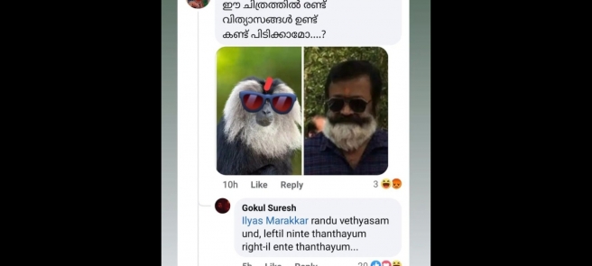 ഫെയ്സ്ബുക്കിൽ സുരേഷ് ഗോപിയെ അപമാനിച്ച് കമ്മന്റ് ഇട്ട വ്യക്തിക്ക് കിടിലൻ മറുപടി നൽകി സുരേഷ് ഗോപിയുടെ മകൻ ഗോകുൽ സുരേഷ്. സുരേഷ് ഗോപിയുടെയും ഒരു കുരങ്ങന്റെയും ഫോട്ടോ ഇട്ടിട്ട് ഈ രണ്ടു ചിത്രത്തിനും ഒരു സാമ്യമുണ്ട് എന്ന് ആയിരുന്നു ആക്ഷേപിച്ചത്.
