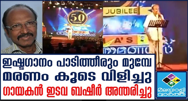 ഗാനമേളക്കിടെ കുഴഞ്ഞുവീണു... പ്രശസ്ത ഗായകന് ഇടവ ബഷീര് അന്തരിച്ചു; ഗാനമേളക്കിടെ കുഴഞ്ഞുവീണാണ് അന്ത്യം; സ്റ്റേജില് കുഴഞ്ഞു വീണ ബഷീറിനെ ഉടന് ആശുപത്രിയില് എത്തിച്ചെങ്കിലും രക്ഷിക്കാനായില്ല; ഗാനമേളയെ ജനപ്രിയമാക്കുന്നതില് സുപ്രധാന പങ്കുവച്ച കലാകാരനെ ആദരിച്ച് കേരളം