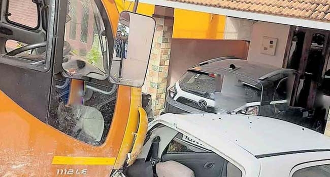 മത്സ്യം കയറ്റിവന്ന ലോറി നിയന്ത്രണം വിട്ട് ഇടിച്ചു കയറി മതിലുകളും രണ്ടു കാറും വൈദ്യുത പോസ്റ്റും തകര്ന്ന നിലയില്