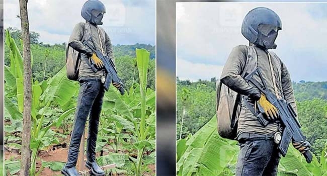 ഞാന് കാത്തോളാം... പഴയ കോലമൊക്കെ മാറി കൃഷിക്ക് കണ്ണുപെടാതിരിക്കാനായി കോന്നിയിലെ വാഴത്തോപ്പില് തോക്കേന്തി നില്ക്കുന്ന സൈനികന്റെ രൂപവും ഹെല്മറ്റുമൊക്കെയായി ന്യൂജെന് കോലം കൗതുകകാഴ്ചയായി.