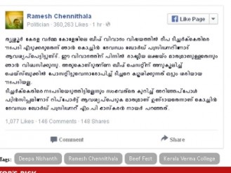 ബീഫ് ഫെസ്റ്റുമായി ബന്ധപ്പെട്ട വിവാദത്തില് തൃശൂര് കേരള വര്മ്മ കോളേജ് അധ്യാപിക ദീപ നിഷാന്തിന് പിന്തുണയുമായി ആഭ്യന്തര മന്ത്രി രമേശ് ചെന്നിത്തല രംഗത്തെത്തി.