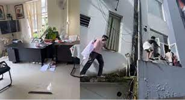 കുറെ ഫയലുകൾ നശിപ്പിച്ച ശേഷം രാഹുൽ ഗാന്ധിയുടെ തകർത്ത ചിത്രം സഹിതം അദ്ദേഹത്തിന്റെ കസേരയിൽ വാഴ വച്ചു. 19 പേരെ പൊലീസ് കയ്യോടെ അറസ്റ്റ് ചെയ്തു.