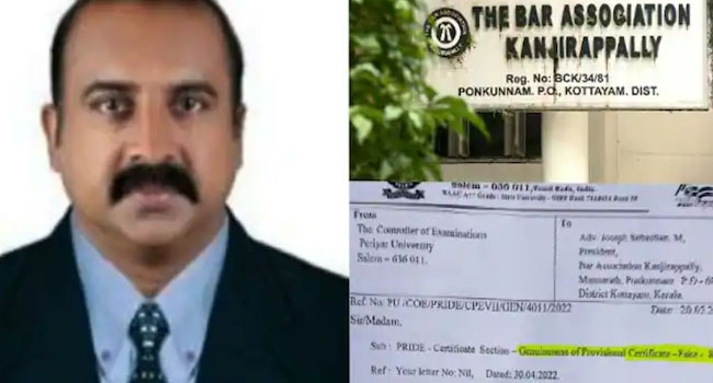 തമിഴ്നാട്ടിലെ പെരിയാര് സര്വകലാശാലയില് നിന്ന് ബിബിഎ. പിന്നെ ഭോപ്പാലിലെ ആര്കെഡിഎഫ് സര്വകലാശാലയില് നിന്ന് ത്രിവല്സര നിയമ ബിരുദവും നേടിയെന്ന് അവകാശപ്പെട്ടാണ് പൊന്കുന്നം സ്വദേശി അഫ്സല് ഹനീഫ് ബാര് കൗണ്സിലില് അഭിഭാഷകനായി എന് റോള് ചെയ്ത് പൊന്കുന്നം കോടതിയില് പ്രാക്ടീസ് തുടങ്ങിയത്. എന്നാല് അഫ്സലിന്റെ ബിബിഎ സര്ട്ടിഫിക്കറ്റ് വ്യാജമാണെന്ന് പെരിയാര് സര്വകലാശാല തന്നെ വ്യക്തമാക്കി.