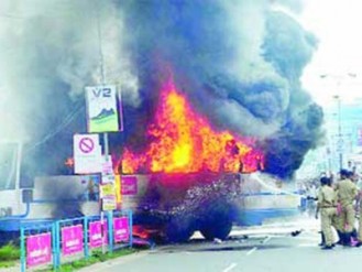 കോഴിക്കോട് നിയന്ത്രണം വിട്ട ബസ് ബൈക്കിലിടിച്ച് ബസിനു തീപിടിച്ചു, യാത്രക്കാര് കുറവായതിനാല് വന് അപകടം ഒഴിവായി