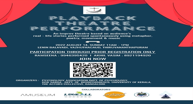 തിരുവനന്തപുരം:ബാംഗ്ലൂർ കേന്ദ്രീകരിച്ച് പ്രവർത്തിക്കുന്ന ദി ആക്ടേഴ്സ് കളക്ടീവും കേരള സർവകലാശാല സൈക്കോളജി അസോസിയേഷൻ ഡിപ്പാർട്ട്മെന്റ് ഓഫ് സൈക്കോളജിയും ഡി സി ബി സർഗ ഡിപ്പാർട്ട്മെന്റ് ഓഫ് കമ്പ്യൂട്ടേഷണൽ ബയോളജി ആൻഡ് ബയോഇൻഫോമാറ്റിക്സും സംയുക്തമായി സംഘടിപ്പിക്കുന്ന പ്ലേ ബാക്ക് തിയേറ്റർ പെർഫോമൻസ് ആഗസ്റ്റ് 14 ന് രാവിലെ 11 ന് തിരുവനന്തപുരം വഴുതക്കാട് ലെനിൻ ബാലവാടിയിൽ വെച്ച് നടത്തുന്നു. രജിസ്ട്രേഷനും കൂടുതൽ വിവരങ്ങൾക്കും ബന്ധപ്പെടുക : -9946395420, 918921194920.