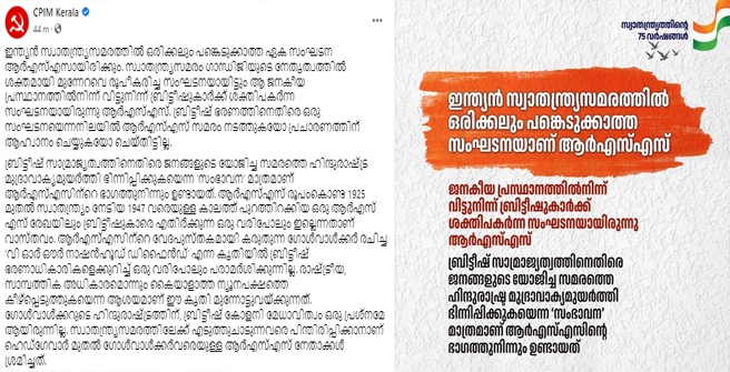 'ഇന്ത്യൻ സ്വാതന്ത്ര്യസമരത്തിൽ ഒരിക്കലും പങ്കെടുക്കാത്ത ഏക സംഘടന ആർഎസ്എസായിരിക്കും. സ്വാതന്ത്ര്യസമരം ഗാന്ധിജിയുടെ നേതൃത്വത്തിൽ ശക്തമായി മുന്നേറവെ രൂപീകരിച്ച സംഘടനയായിട്ടും ആ ജനകീയ പ്രസ്ഥാനത്തിൽനിന്ന് വിട്ടുനിന്ന് ബ്രിട്ടീഷുകാർക്ക് ശക്തിപകർന്ന സംഘടനയായിരുന്നു ആർഎസ്എസ്...' വൈറലായി സിപിഐഎം ഫേസ്ബുക്ക് പോസ്റ്റ്