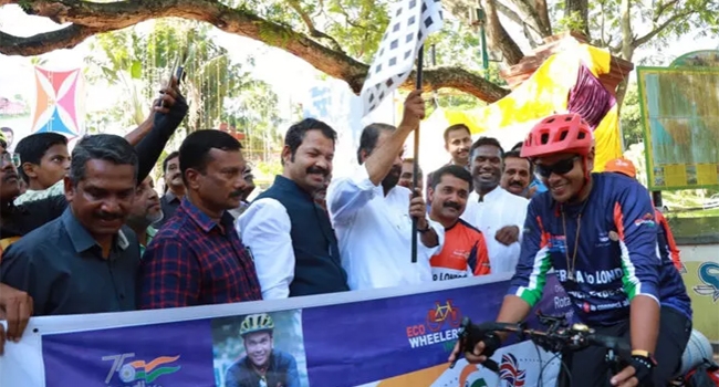 75ാം സ്വാതന്ത്ര്യദിന വാര്ഷികാഘോഷത്തിന്റെ ഭാഗമായി ലോക രാജ്യങ്ങള് പരസ്പര സ്നേഹത്തില് വര്ത്തിക്കണമെന്ന സ്നേഹ സന്ദേശത്തോടെയാണ് ടീം എക്കോ വീലേഴ്സിന്റെ നേതൃത്വത്തില് റോട്ടറി ഇന്റര്നാഷനലിന്റെ പിന്തുണയോടെയാണ് കോഴിക്കോട് തലക്കുളത്തൂര് സ്വദേശി ഫായിസ് അഷ്റഫ് അലിയുടെ (34) സൈക്കിള് യാത്ര.