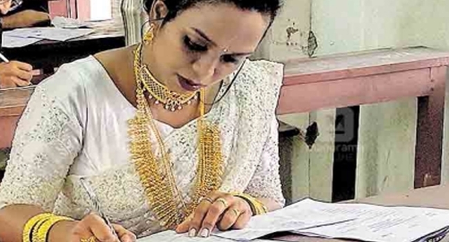 പരീക്ഷ ഒന്നര മണിക്കൂറിനുള്ളില് എഴുതി തീര്ത്ത് കല്യാണചടങ്ങുകളിലേക്കായി ദേവലായത്തിലേക്ക്.... പരീക്ഷാ ദിനവും വിവാഹ ദിവസവും ഒന്നായതോടെ അനീന കോളജിലെത്തിയത് മണവാട്ടിയായി ഒരുങ്ങി