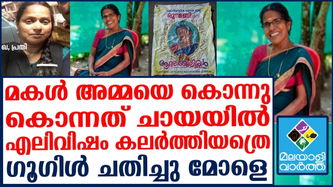 അതിനിടെ ചായയില് എലിവിഷം കലര്ത്തി മകള് അമ്മയെ കൊല്ലപ്പെടുത്തിയെന്നു പറയുന്നു. കേസുമായി ബന്ധപ്പെട്ട് മകള് ഇന്ദുലേഖയെ പൊലീസ് കസ്റ്റഡിയില് ചോദ്യം ചെയ്തു വരികയാണ്. ഇവര് കുറ്റം സമ്മതിച്ചതായി പൊലീസ് അറിയിച്ചു.