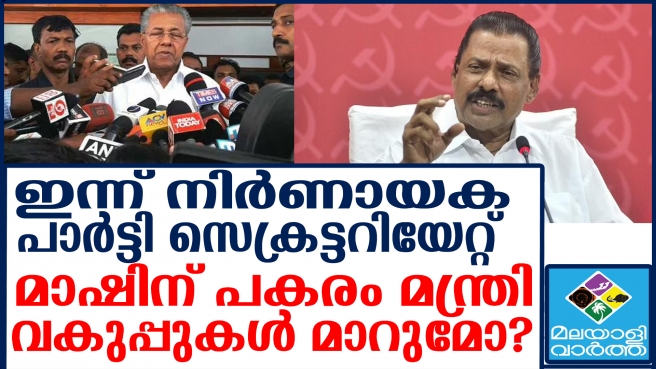കൊച്ചിയില് പ്രധാനമന്ത്രിയുടെ പരിപാടിയില് പങ്കെടുക്കുന്ന മുഖ്യമന്ത്രി ഉച്ചയ്ക്കു തിരിച്ചെത്തും അതോടെ തീരുമാനമാകും. പുതിയ പാര്ട്ടി സെക്രട്ടറി എം.വി.ഗോവിന്ദന് ഇന്നോ നാളെയോ മന്ത്രിസ്ഥാനം രാജിവെച്ചേക്കും. കണ്ണൂരില് നിന്നുള്ള സംസ്ഥാന കമ്മിറ്റി അംഗം എ.എന്.ഷംസീര്, മറ്റു സംസ്ഥാന കമ്മിറ്റി അംഗങ്ങളായ കെ.വി.കുഞ്ഞന്പു, പി.നന്ദകുമാര് തുടങ്ങിയവരുടെ പേരുകള് ആണ് ഉയര്ന്നു കേള്ക്കുന്നത്.