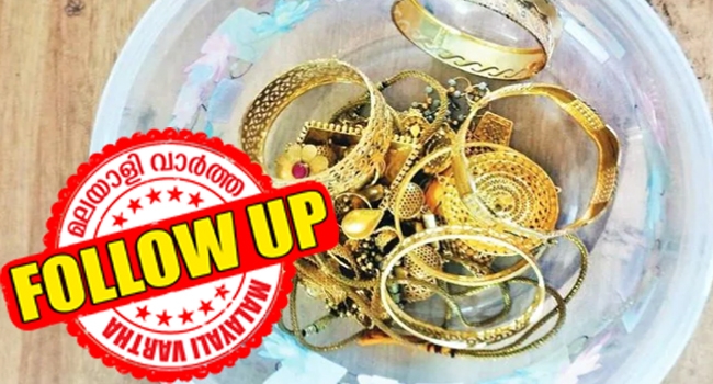 വെള്ളമൊഴുകുന്നതു തടയാനായി വാല്വ് പൂട്ടിയിരുന്നു. തുടര്ന്ന് വ്യാഴാഴ്ച രാവിലെ ഇതു ശരിയാക്കുന്നതിനു വേണ്ടി ശൗചാലയത്തിലെ ഫ്ളഷ് പരിശോധിച്ചപ്പോഴാണ് അതിനുള്ളില് സ്വര്ണാഭരണങ്ങള് കണ്ടെത്തിയത്. പാദസരം, താലിമാല, നെക്ലെയ്സ്, വളകള് തുടങ്ങിയ കവര്ച്ച ചെയ്ത മുഴുവന് സ്വര്ണാഭരണങ്ങളും അതിലുണ്ടായിരുന്നു.