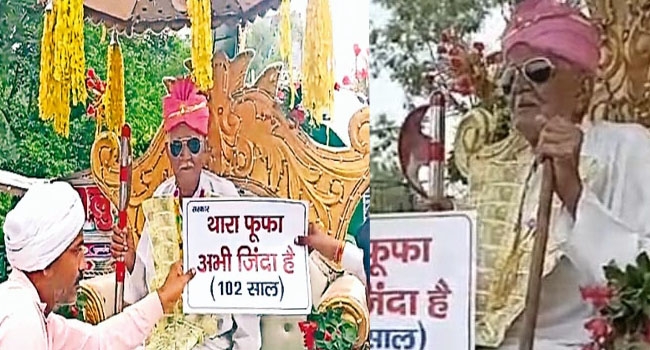 സര്ക്കാര് രേഖകളില് മരിച്ച 102-കാരന് പെന്ഷന് കിട്ടാന് പ്രതിഷേധിക്കുന്നു... തുടര്ന്ന് താന് ജീവനോടെയുണ്ടെന്ന് അറിയിക്കാനിയ ദുലി ചന്ദ് രഥത്തിലേറി ആഘോഷമായി നാട് മുഴുവന് ചുറ്റി. 'നിങ്ങളുടെ അമ്മാവന് ജീവനോടെയുണ്ട്' എന്ന പ്ലക്കാര്ഡ് പിടിച്ചായിരുന്നു ഈ നാടുചുറ്റല്... അദ്ദേഹത്തെ പിന്തുണച്ച് നാട്ടുകാരും ഒപ്പം കൂടി....
