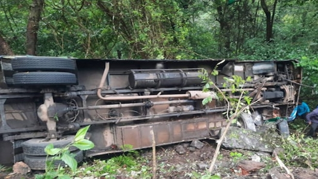 കെ.എസ്.ആർ.ടി.സി ബസ് തലകീഴായി മറിഞ്ഞ് ഒരാൾ മരിച്ചു, 25 പേർക്ക് പരിക്ക്, വാഹനത്തിന് സൈഡ് കൊടുക്കുന്നതിനിടെ ടയർ പൊട്ടി ബസ് താഴേക്ക് മറിയുകയായിരുന്നു, മരത്തിൽ ബസ് തട്ടിനിന്നതിനാൽ വലിയ അപകടത്തിൽ നിന്ന് രക്ഷപെടുകയായിരുന്നുവെന്ന് യാത്രക്കാർ